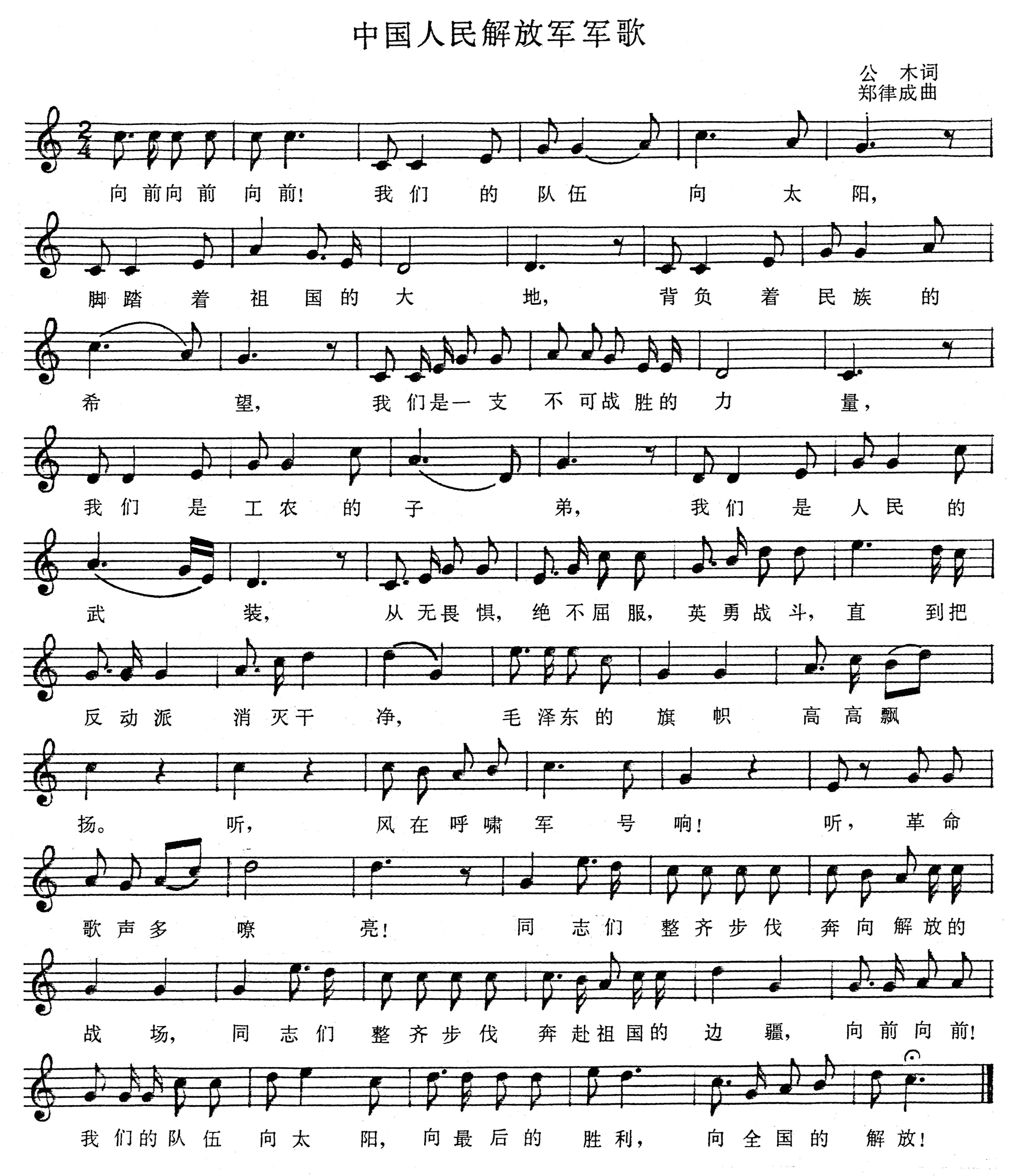 公木词,郑律成曲。原名《中国人民解放军进行曲》。 1939年秋,公木、郑律成在延安合作创作《八路军大合唱》组歌,《八路军进行曲》是组歌中的8首歌曲之一。同年冬,由郑律成指挥,在延安中央大礼堂举行首场演出。1940年夏,《八路军进行曲》在《八路军军政杂志》刊载后,便在各抗日根据地传唱。194...