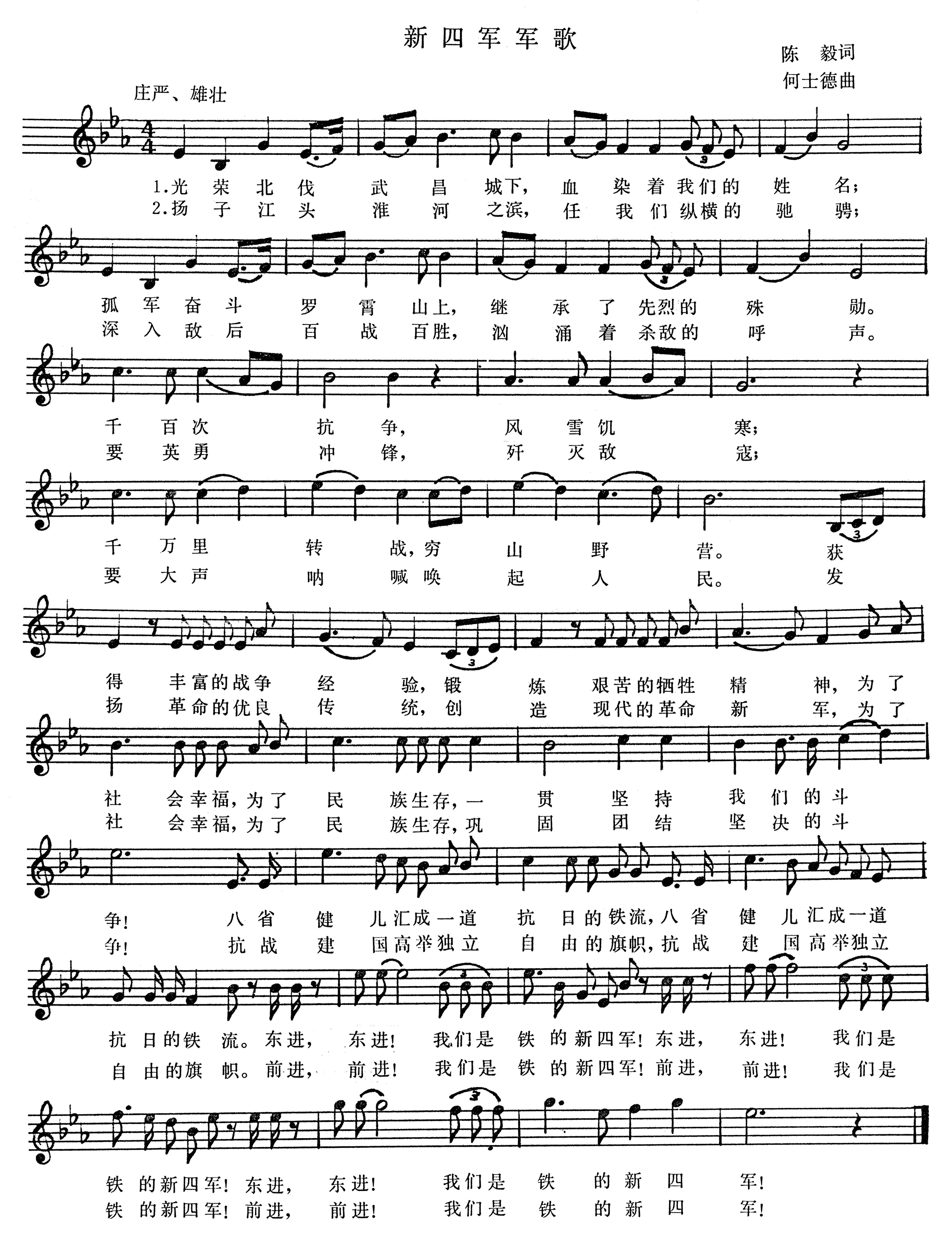 陈毅词,何士德曲。1939年春,为动员新四军广大指战员贯彻执行中国共产党的抗日民族统一战线和新四军的作战方针,配合部队进行革命传统教育,鼓舞士气,新四军军部领导人决定创作一首新四军军歌。陈毅于同年3月30日写出诗歌《十年》,作为歌词的基础,经叶挺、项英、陈毅、袁国平、周子昆、李一氓等集体讨论...
