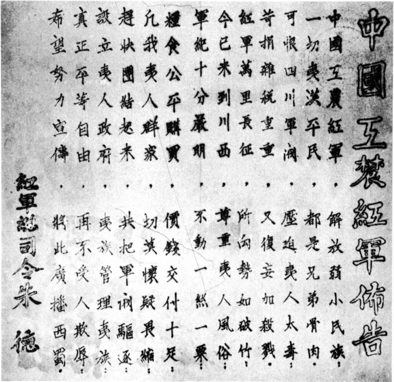 1935年5月,中央红军为迅速抢占大渡河,决定穿越川西彝族聚居区。由于历史上反动统治阶级实行民族压迫政策,彝族群众对汉人有很深的猜忌和敌视,企图阻止红军入境。为消除彝族群众的疑虑,号召彝族群众同红军合作,红军以总司令朱德的名义发布布告。主要内容有:①宣传红军的工农武装性质和解放弱小民族的目的。②...