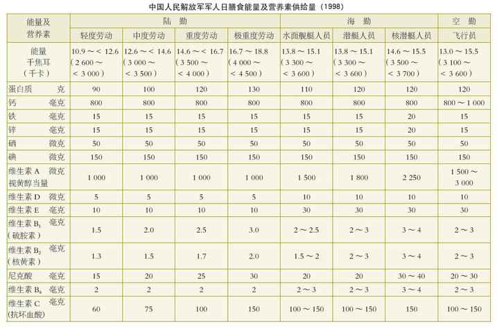 维持军人正常生理功能和执勤、训练、作战需要的食物营养素数量的规定。包括蛋白质、糖类(碳水化合物)、脂肪、维生素和矿物质。是制定军人食物供给标准和评价部队膳食营养状况的依据。 各国饮食习惯、经济发展水平、军人身体素质要求,以及使用武器装备、执行军事任务不同,军人营养素供给量标准也不尽一致。如蛋白...