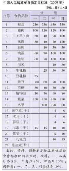 对军人每人每天主副食供应品种、数量和质量所作的规定。给养供给标准的组成部分。由军队最高后勤领导机关制定,是组织给养供应和制定伙食费标准及衡量部队生活水平的依据。主要根据军人所从事工作的劳动强度和所在部队的性质,以及国家工农业生产发展水平等确定。 中国历史上就有军人粮食定量标准。如清乾隆五十年(...