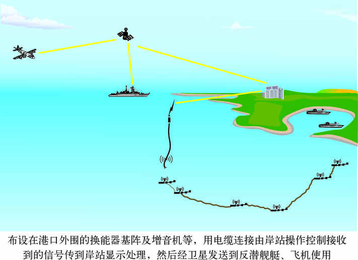 以海岸为基地,换能器基阵布放在近岸水域或敏感水域的声呐。又称海岸声呐。反潜预警系统的主要组成部分。用于海峡、基地、港口、航道和近岸水域对对方潜艇的活动进行远程警戒和监视,引导反潜兵力实施对潜攻击。由换能器基阵、海底电缆和增音机、岸上电子设备及电源等组成。换能器基阵固定在近岸海底或深海山脉上,尺寸...