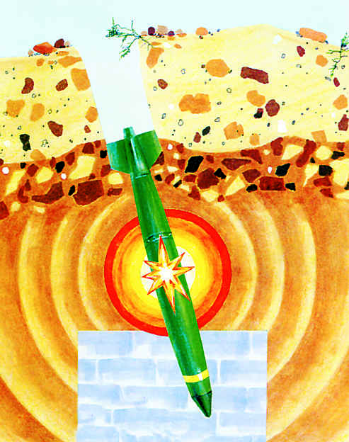 利用聚能效应,毁伤坦克、装甲车等装甲防护目标的航空炸弹。靠聚能装药战斗部爆炸时产生的高温、高压、高速运动的金属射流穿透装甲,杀伤乘员、引爆弹药、引燃易燃物品、摧毁坦克内设备。反坦克炸弹的圆径较小,通常为0.5~2千克级,常以子弹形式集装于子母弹箱内或用弹药发射器抛撒。 航空反坦克炸弹由壳体、药...