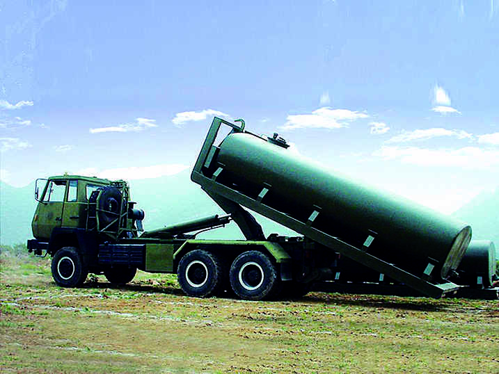 油罐能进行整体自装自卸的运油车。主要包括:①汽车底盘。用作整体自装卸运油车的载运平台,一般通过取力器从汽车底盘变速箱取力,为自装卸装置提供动力。多选用越野汽车底盘进行改装,机动能力较强。②自装卸装置。用于完成托盘式油罐的整体装卸作业,通过副车架与汽车底盘连接,通常为顺装伸缩臂式全液压驱动结构,由...