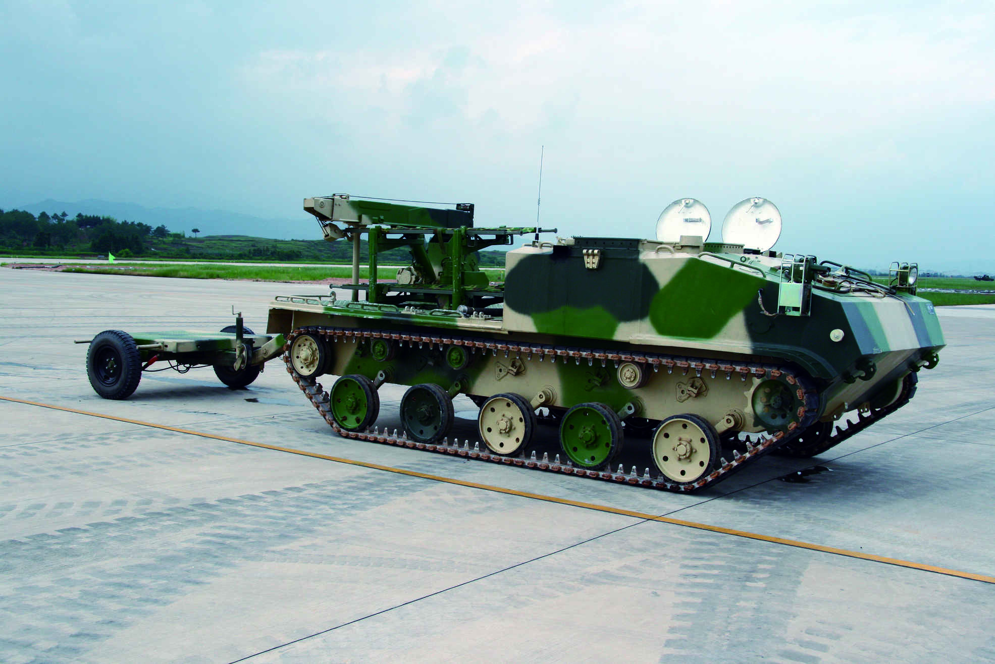 履带式空投物资收集补给车 用于空降场收集空投的物资器材并实施补给的专用车辆。具有多用途、机动性和防护性好、重量轻、便于空运和空投等特点。 空投物资收集补给车采用可空投车辆底盘。有轮式和履带式两种车辆。轮式车辆轻便灵活,履带式车辆对复杂空降场环境适应性强。空投物资收集补给车包括:①空投车辆底盘...