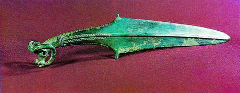 形体短小的剑类兵器。一般直身、尖锋、两刃,后安短柄,柄与身之间常有格,长度大多在20~30厘米。主要作用是扎刺。在中国古代,“匕首”一词始见于东周晚期的文献。《史记·吴太伯世家》司马贞索隐:“刘氏曰:‘匕首,短剑也。’……《通俗文》云:‘其头类匕,故曰匕首。’”“匕”是中国古代的青铜食器,类于后...