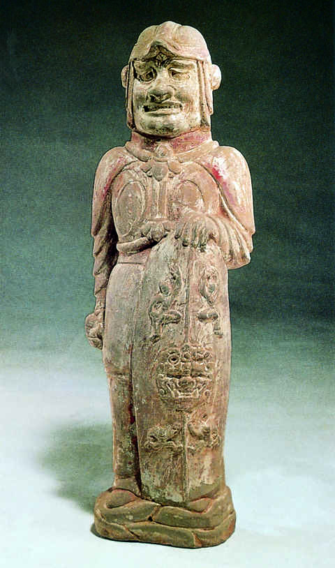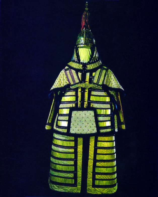 中国古代在胸甲、背甲上设有圆护的金属铠甲。因前胸和后背都设有左右两面大型的圆护,在太阳照射下可发出明光,故名。明光铠最早出现于三国时期,见于魏曹植《先帝赐臣铠表》中。北朝时逐渐盛行。北魏太和年间(477~499)以后,逐渐取代了两当铠成为重装骑兵的主要铠甲。明光铠除了带有圆护的身甲外,还附有保护...