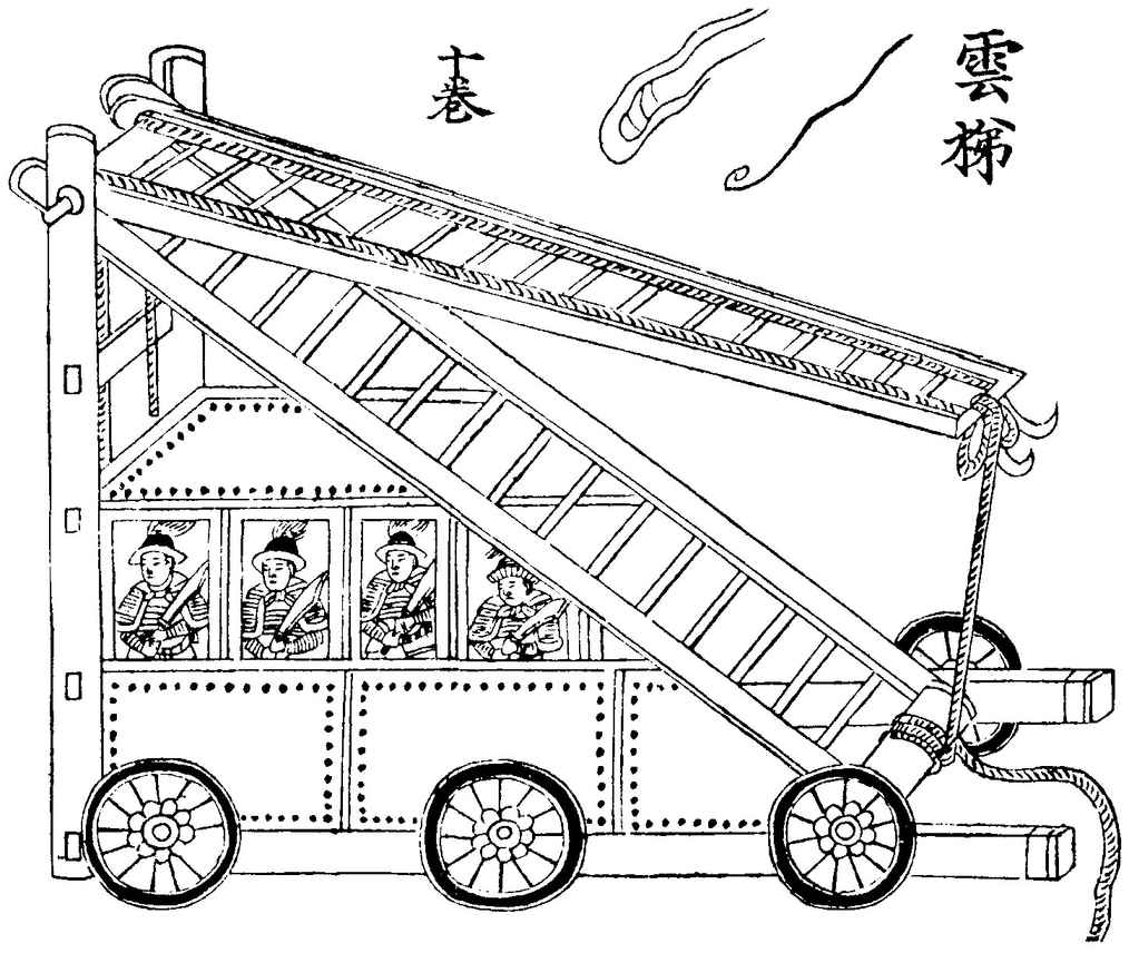 古代战争中用以攀登城墙的攻城器械。《淮南子·修务训》高诱注说:“云梯,攻城具,高长上与云齐,故曰云梯。”它由一般的梯子发展而来。古代战争中使用的云梯,有些就是普通长梯子。 在中国古代,一般认为云梯的发明者是春秋时期的鲁国巧匠公输般。《墨子·公输》记载,公输般在春秋末年曾为楚王造云梯攻宋,但其建...
