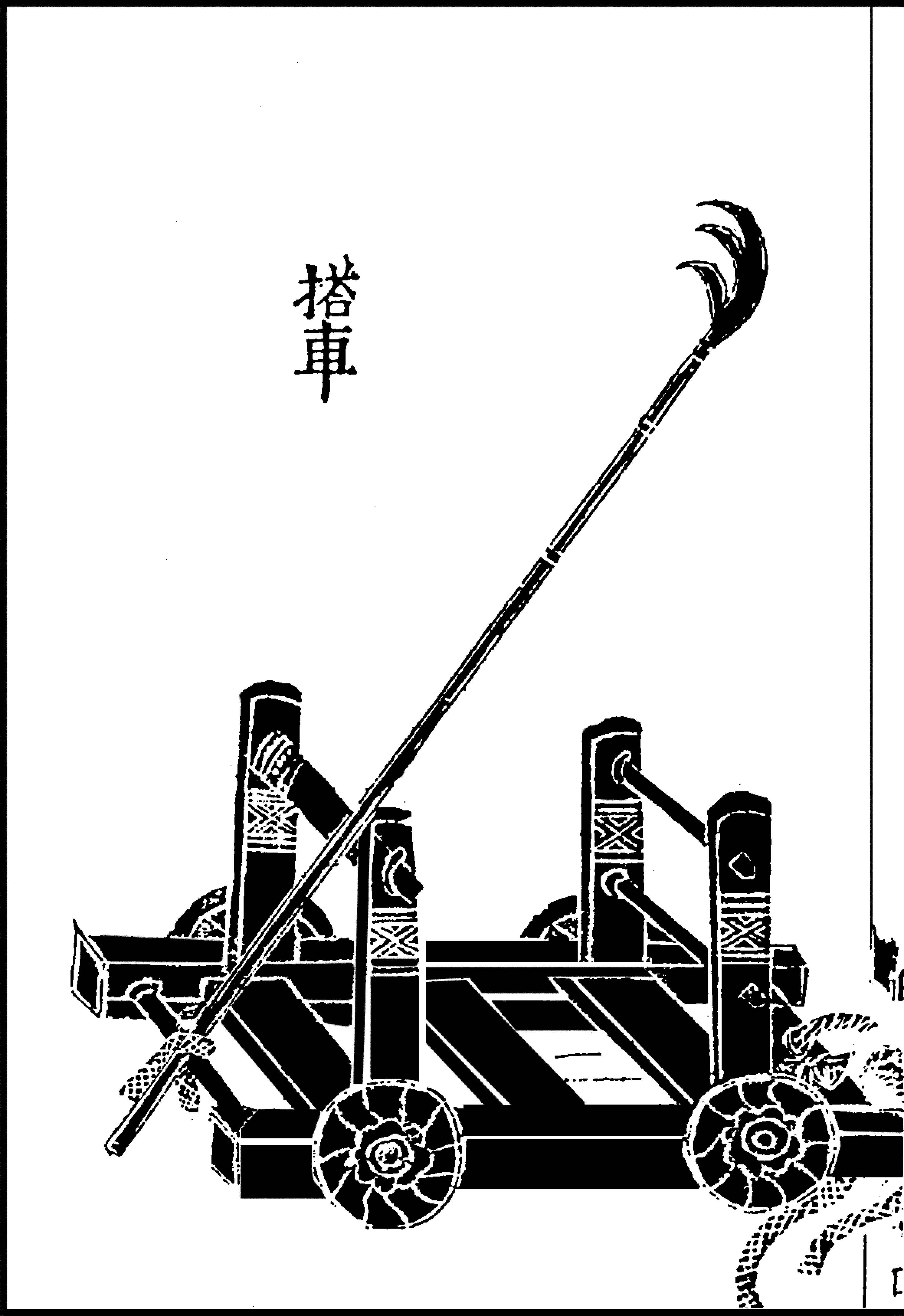 中国古代装有长杆铁钩爪用以钩毁城墙的轮式攻城器械。又称钩堞车、搭车等。它由木车和大铁钩爪两部分构成。木车外侧装有四轮运行;车上立四木,设置前梁和后滚轴以支撑、摆放铁钩爪;车前系有绳索牵引。巨大的铁钩爪头上有数个弯钩状铁爪,并安装了很长的木柄,用以钩毁城堞。使用时,将车推拉至城下,令人握住长木柄后...