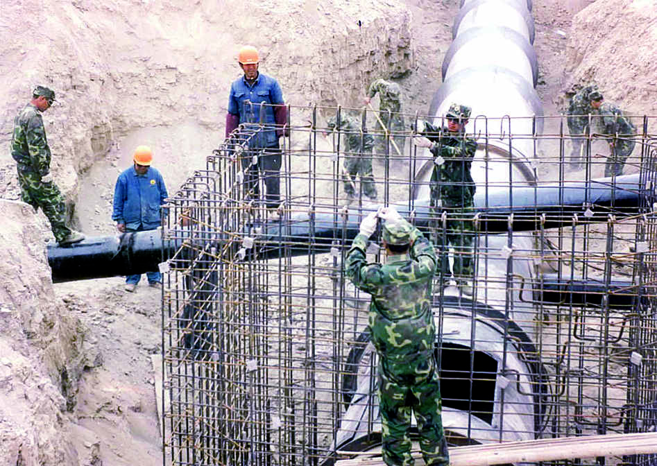 江泽民关于军队在国家建设中的职责任务的思想观点。新疆军区某部积极投身西部开发,支援国家经济建设。图为官兵在输油管线工地施工(2001) 1993年3月22日,江泽民在第八届全国人民代表大会第一次会议解放军代表团会议上的讲话中指出:“军队的同志要自觉服从国家经济建设的大局,坚决拥护和支持改革开放...
