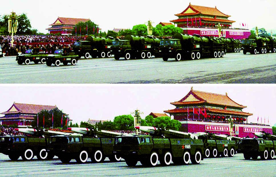 江泽民关于加强中国人民解放军武器装备现代化建设的思想观点。1999年10月1日,参加中华人民共和国成立50周年阅兵仪式的中程战略导弹方队(上图)和地地战术导弹方队(下图) 1993年1月3日,江泽民在中央军事委员会扩大会议上的讲话中指出:“从现在起,为了适应现代技术特别是高技术条件下的作战需要...