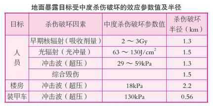 核武器爆炸产生的各种杀伤破坏因素对人员和物体造成的毁伤作用及效果。又称毁伤效应。杀伤破坏因素主要有冲击波、光辐射、早期核辐射、放射性沾染和核电磁脉冲等。 杀伤破坏因素的形成过程及其效应参数规律 以空中核爆炸为例,其杀伤破坏因素形成过程是:在核爆炸瞬间释放出巨大的能量,使核反应区内的温度升高到数...