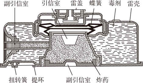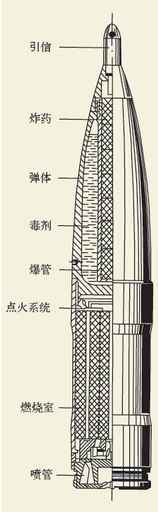 化学火箭弹结构示意图 装填毒剂或毒剂前体的火箭弹。由战斗部、推进部和稳定装置组成。战斗部由弹体、毒剂或毒剂前体、爆管和引信等组成;推进部由推进剂、点火系统、燃烧室和喷管等组成;稳定装置主要有两种形式:一种是靠尾翼稳定;另一种是靠火箭旋转稳定,旋转力由斜喷管在喷射时产生切向推动力提供,又称涡轮式...