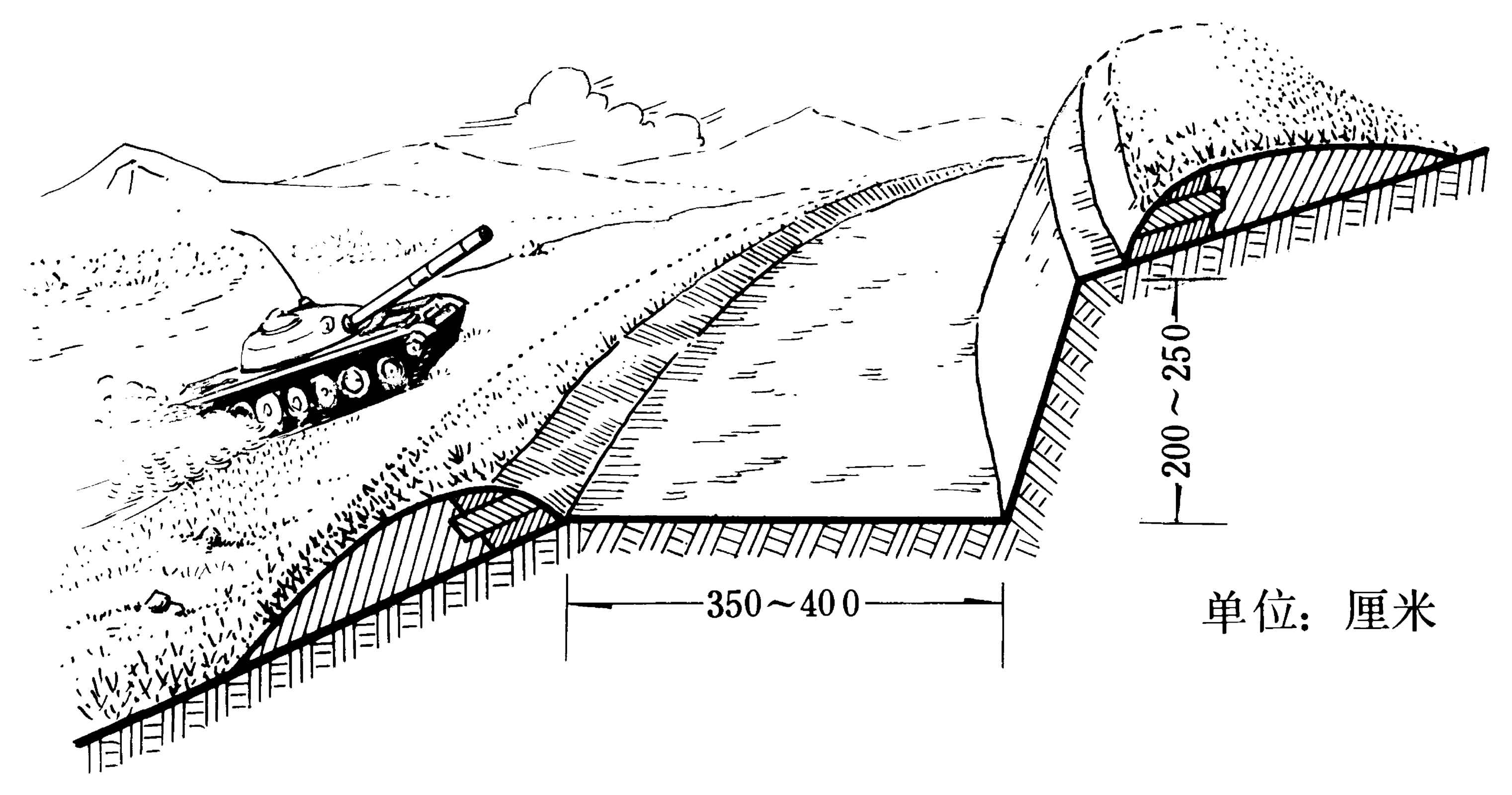 面向敌方的陡壁式土工障碍物。通常构筑在15°~45°的向敌斜坡上,也可利用梯田、堤坎等改造而成。崖壁高度不小于2米,底宽3.5~4米,构筑时底部稍向内侧倾斜,使敌方坦克难以用冲撞的方式克服崖壁。当崖壁高度不足或前方接近地较平坦时,可在崖壁前面构筑防坦克减速沟坝,以削弱敌坦克对崖壁的冲撞力。在土质...